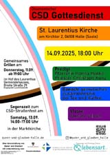 Seit zehn Jahren organisieren wir einen Gottesdienst, der im Rahmen des Christopher Street Days stattfindet. Zu diesem CSD-Gottesdienst in der Laurentiuskirche in Halle kommen alljährlich über 50 Gäste.